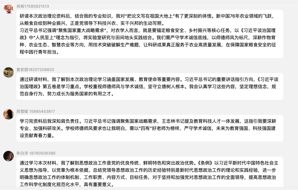 学习内容丰富且意义深远。在研读庆祝中华人民共和国成立76周年招待会上习近平总书记的重要讲话,同学们深刻领悟到国家发展背后的磅礴力量,强国复兴的自信底气在心中激荡;从习近平总书记对党校、教育、人才工作的重要指示里,大家锚定了为党为民的科研坐标,认识到科研工作应紧密围绕党和国家的需求展开;《中国共产党思想政治工作条例》以及长江大学师德师风建设文件的学习,则让同学们明晰了科研道路上的价值取向与行为准则,坚定了以德立身、以德立学的信念。