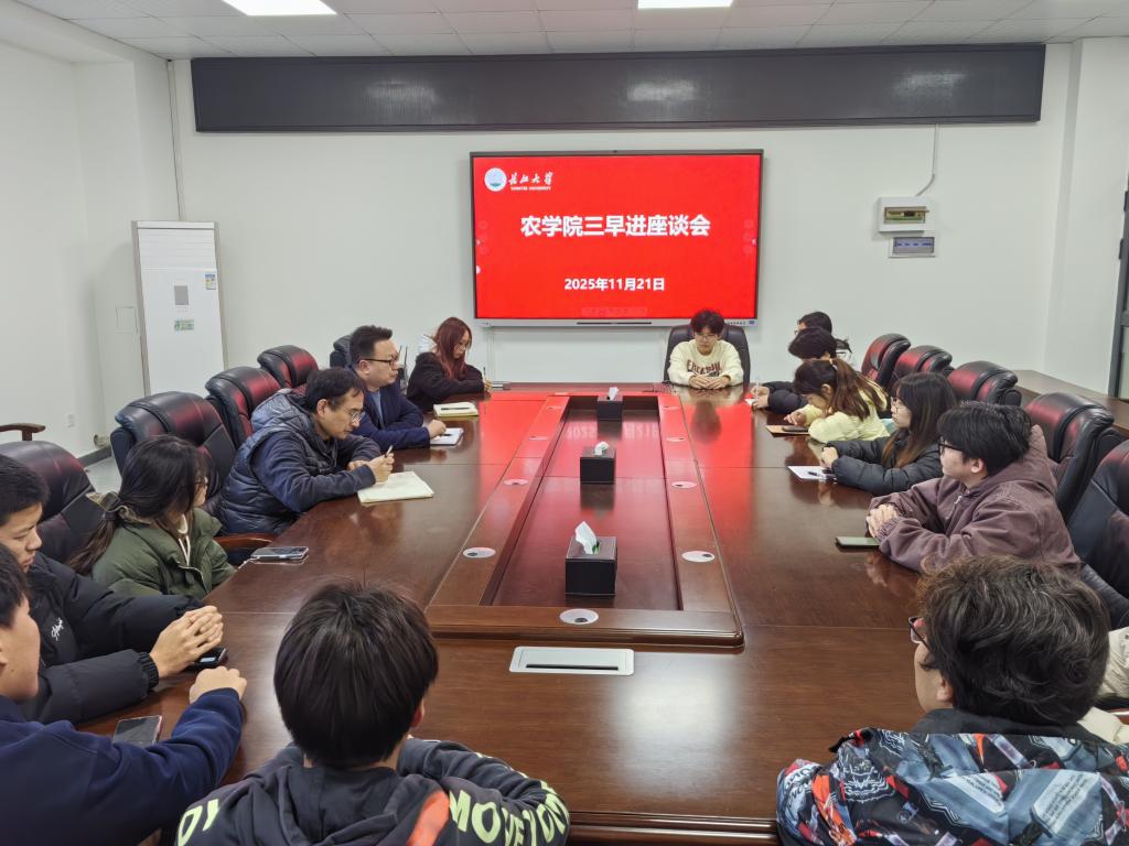 (通讯员 邹芮/文 唐玉婷/摄)为践行“厚德笃行、丰食天下”院训,深化我院“三早进”(早进课题组、早进实验室、早进试验田)工作,促进新生厚植学农爱农情怀,坚定强农兴农的时代使命,我院于11月21日中午12:30在农科大楼3064召开了三早进座谈会。党委副书记尹小华、副院长邓建新、辅导员唐玉婷以及2025级和2024级全体班长参加了此次会议。